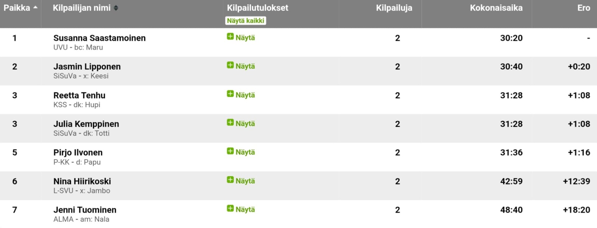 Ja sitten pieni lisäys jälkikäteen, kun Susanna tarkensi, että kyseessä oli kahden päivän yhteistuloksissa käytävä kisa. Ja koska eilen voitto tuli parillakymmenellä sekunnilla ja tänään taivuttiin vain kahdella, niin Marulle ja Susannalle siis voitto Ohkolasta! Hienosti se bortsukin siellä painelee kun on kova juoksija perässä! Onnea!