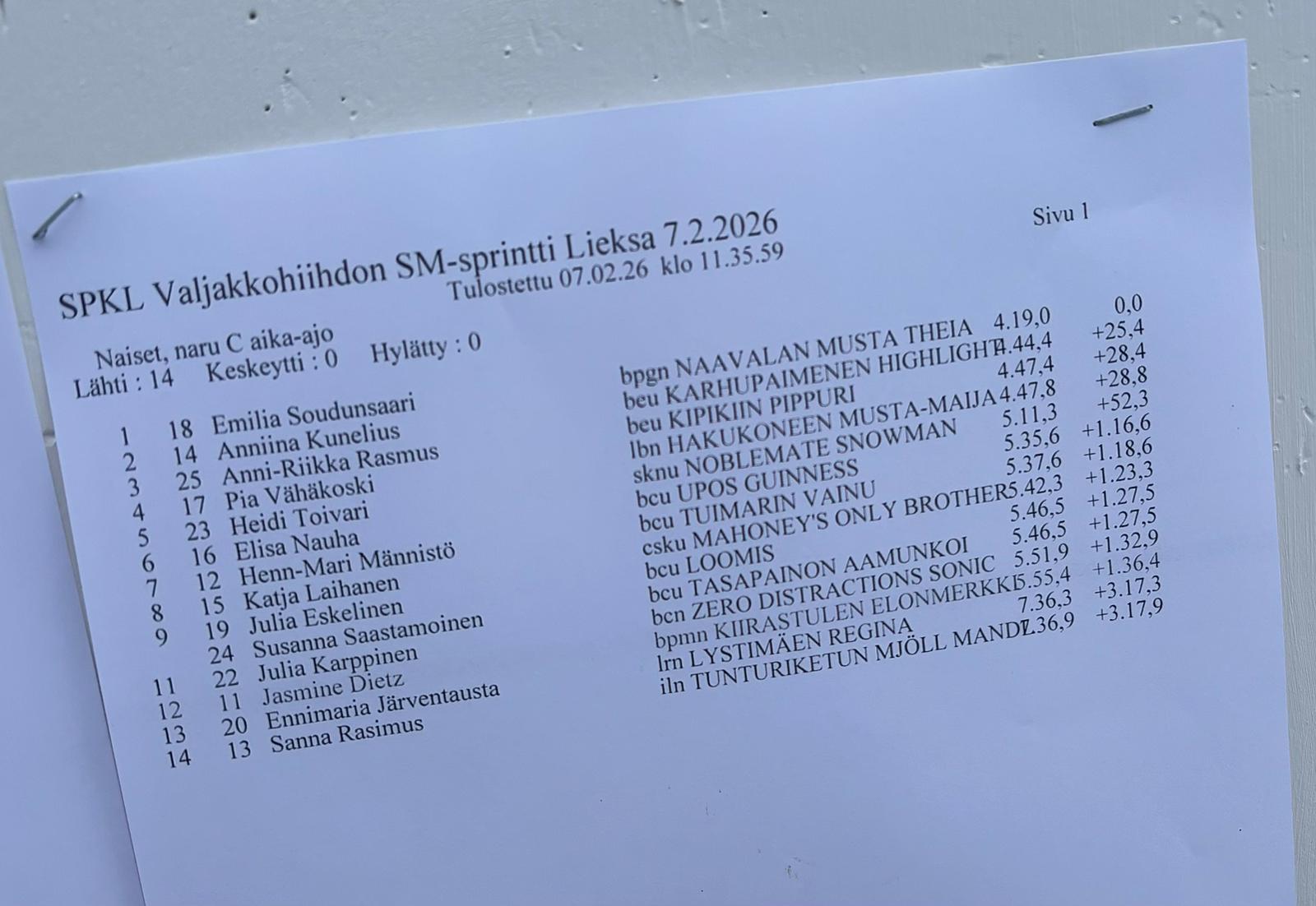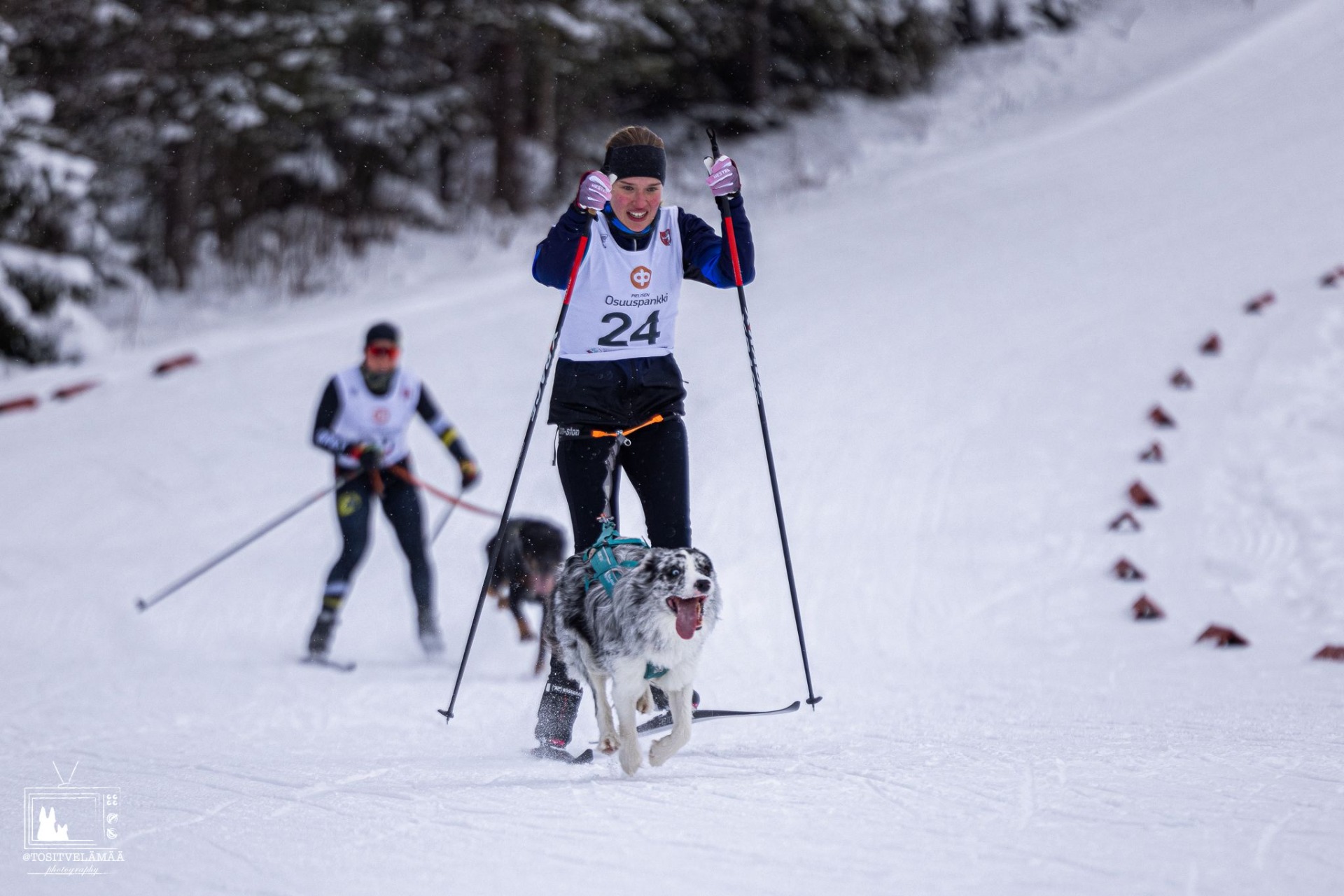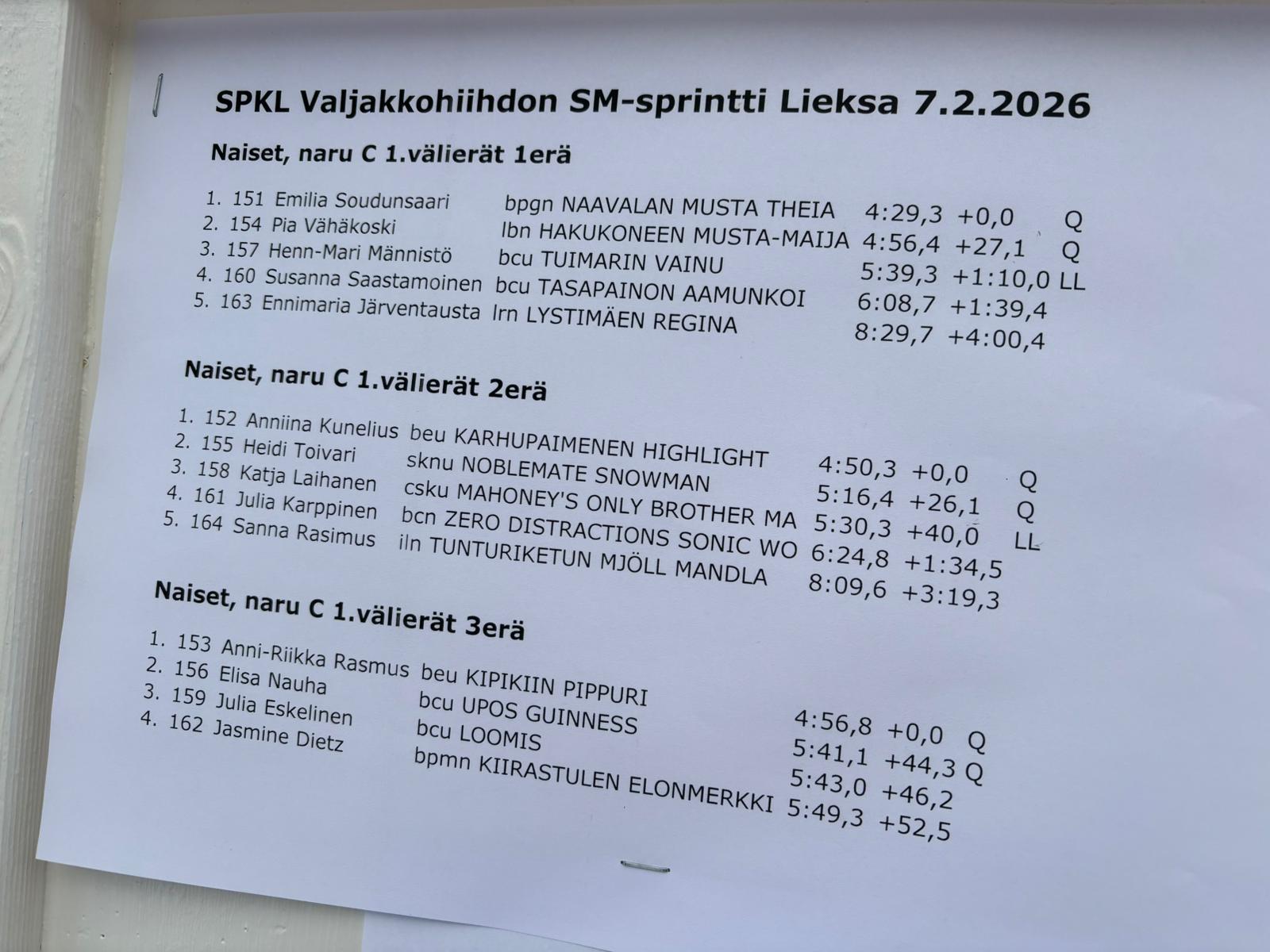 Tuo on kyllä aikamoinen tilanne aloittaa valjakkohiihtokisat! Valjakkohiihdon sprintti-kilpailuissa (samoin kuin viestin ensimmäisen osuuden lähdössäkin) välierien lähtö tehdään niin, että ohjaaja pitää koiraa valjaista ja lykkii toisella kädellä vauhtia 50m matkan, ennen kuin koiran valjaasta saa päästää irti. Tällä kertaa tämä tehtiin vielä ilmeisesti lumen puutteen vuoksi ilman perinteisen latu-uria auttamaan suuntaamisessa! Tällaisia lähtöjä ei Marulla ja Susannalla ole ollut mitään mahdollisuuksia treenata etukäteen ja mittaa kyllä koiraa joutua kylmiltään tuollaiseen. Onneksi Maru onkin aikaste hieno koira, eikä sitä ollut Susannan valjaassa roikkuminen ja lykkiminen häirinnyt tai hämmentänyt, vaan hienosti sujui yhteislähtö ja muutenkin hienot puhtaat suoritukset. Superhieno starttaus tämänkin vetolajin parissa. Hurjasti onnea!